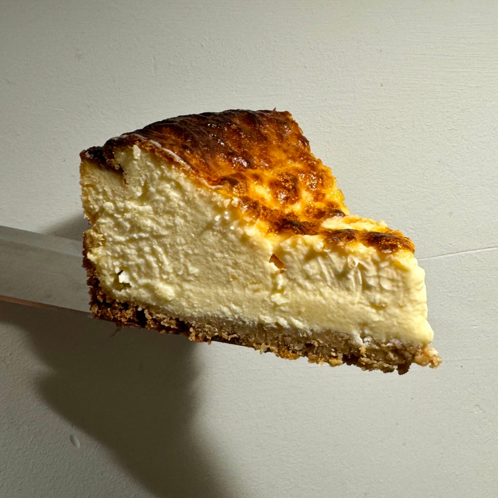 Our Basque-style Cheesecake is a delicate dessert made with Spanish cured cheese, cream cheese, eggs, and heavy cream, all on a crumbly biscuit base. Baked to perfection, it features a caramelized top and a smooth, velvety texture. With its unique depth of flavor, this cheesecake is a true specialty from the Basque Country, offering a memorable way to end any meal
